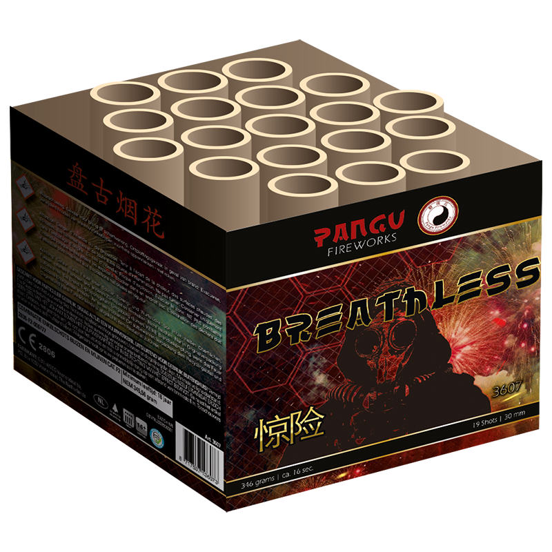 Breathless is een 19 schots 30mm cake uit de Pangu Fireworks serie. Ademloos geniet u van fijne gouden staarten welke ontpoppen naar gouden palmen met rode, groene, en gouden sterren.