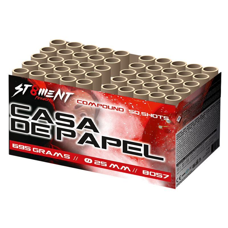 De Casa de Papel gaat voor de grote schat! Deze 50 schots compound schiet prachtige blauwe mines met groene staarten welke ontpoppen in dikke Ti-gouden palmen, gevolgd door dikke knetterpalmen met rode, groene en witte glitters!