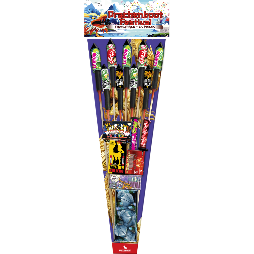 9 grote vuurpijlen vormen de basis van dit hoogwaardige familieassortiment. Totaal 65 stuks!