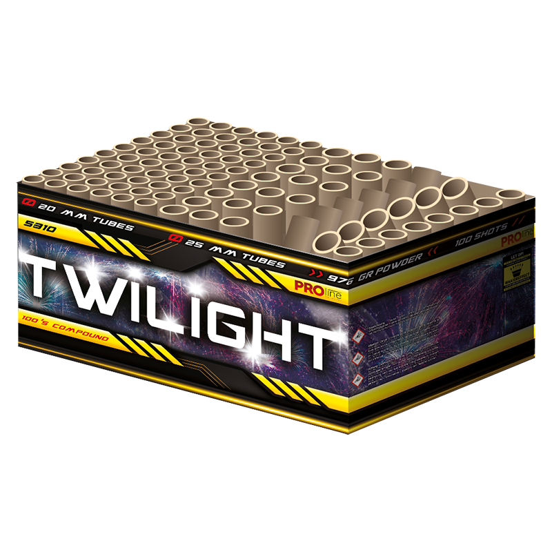 Pro-line Fireworks Twilight, 100 shots, 20+25mm compound. Gekleurde peony met snow-style crackling, gouden salvos met ghost-effecten, fan/z-shape effecten en double gold en enkel goud effecten vormen een ultieme opbouw van begin tot eind. n nProductinformatie: nType product: Siervuurwerk nEffect product: Compound nTube diameter: 20+25mm nFanshape: Ja nClassificatie: CAT.F2 nMinimale leeftijd: 16 jaar nLegaal afsteken op: 31 december nVeiligheidsafstand: minimaal 8 meter nGeschikt voor smalle straten: Nee nGeschikt in Gemeente vuurwerkverbod: Nee Twilight 100 shots 20+25mm Goedkoop vuurwerk kopen bij Vuurwerkwinkel Aalsmeer